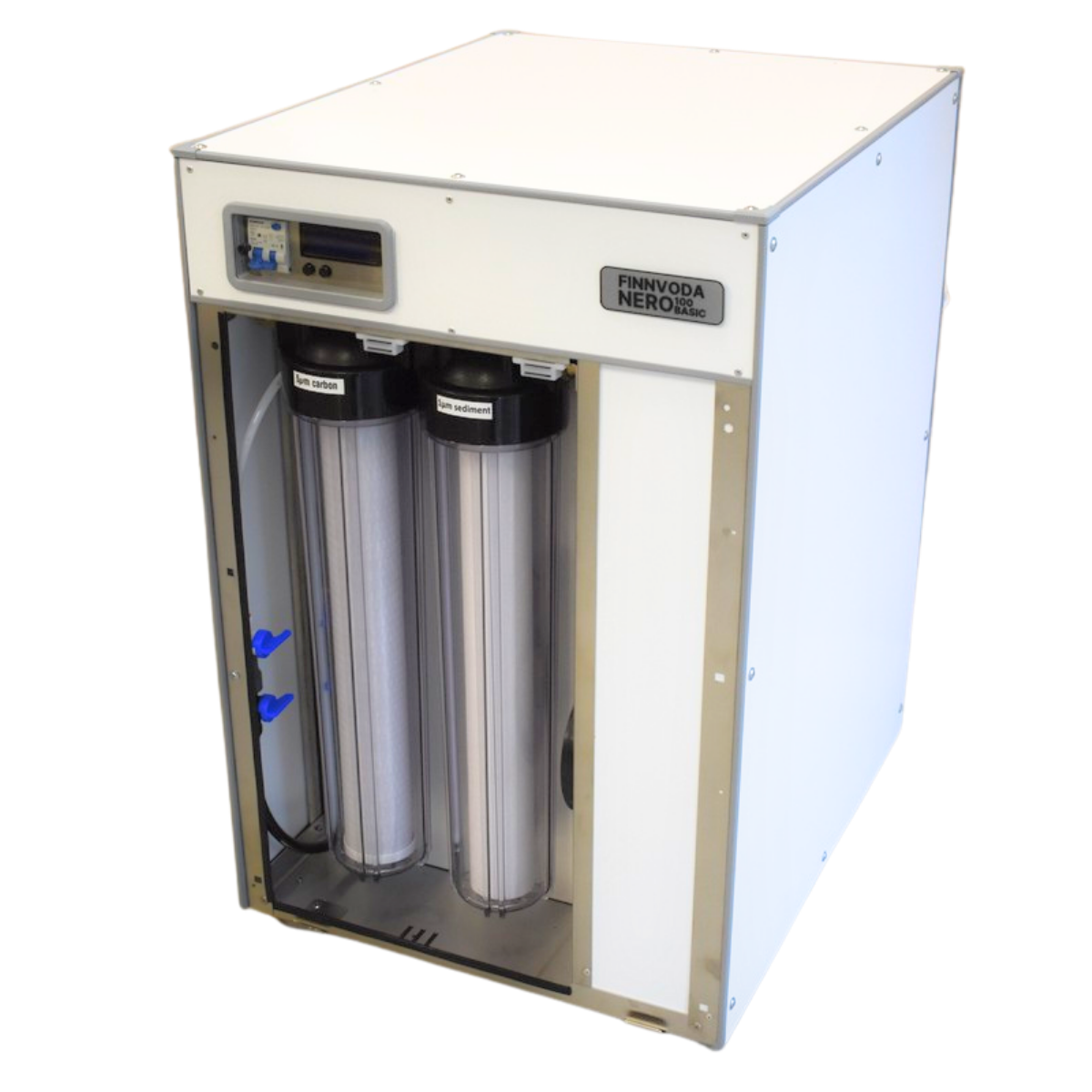 Omvänd osmos filter system NERO 100 BASIC kombinerar vattenrening, lagring och distribution i ett kompakt system med minimala underhållskostnader. Tack vare patenterad teknik är denna finska vattenreningsenhet helt justeringsfri och behöver praktiskt taget aldrig kompletterande teknik, inte ens när den används för att rena problematiskt vatten som innehåller höga halter av järn, salt och mangan. Enheten är även lämplig för att filtrera bort blågrönalgstoxiner