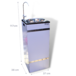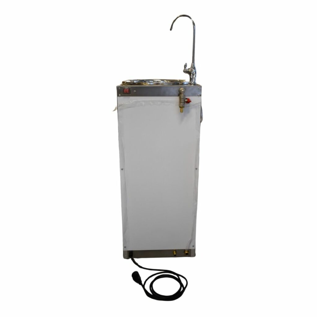 - Producerar en direktströmning på ca 2 liter drickbart vatten per minut till sin egen kran och/eller via en sidokoppling t.ex. till en strandbastu med en trädgårdsslang.