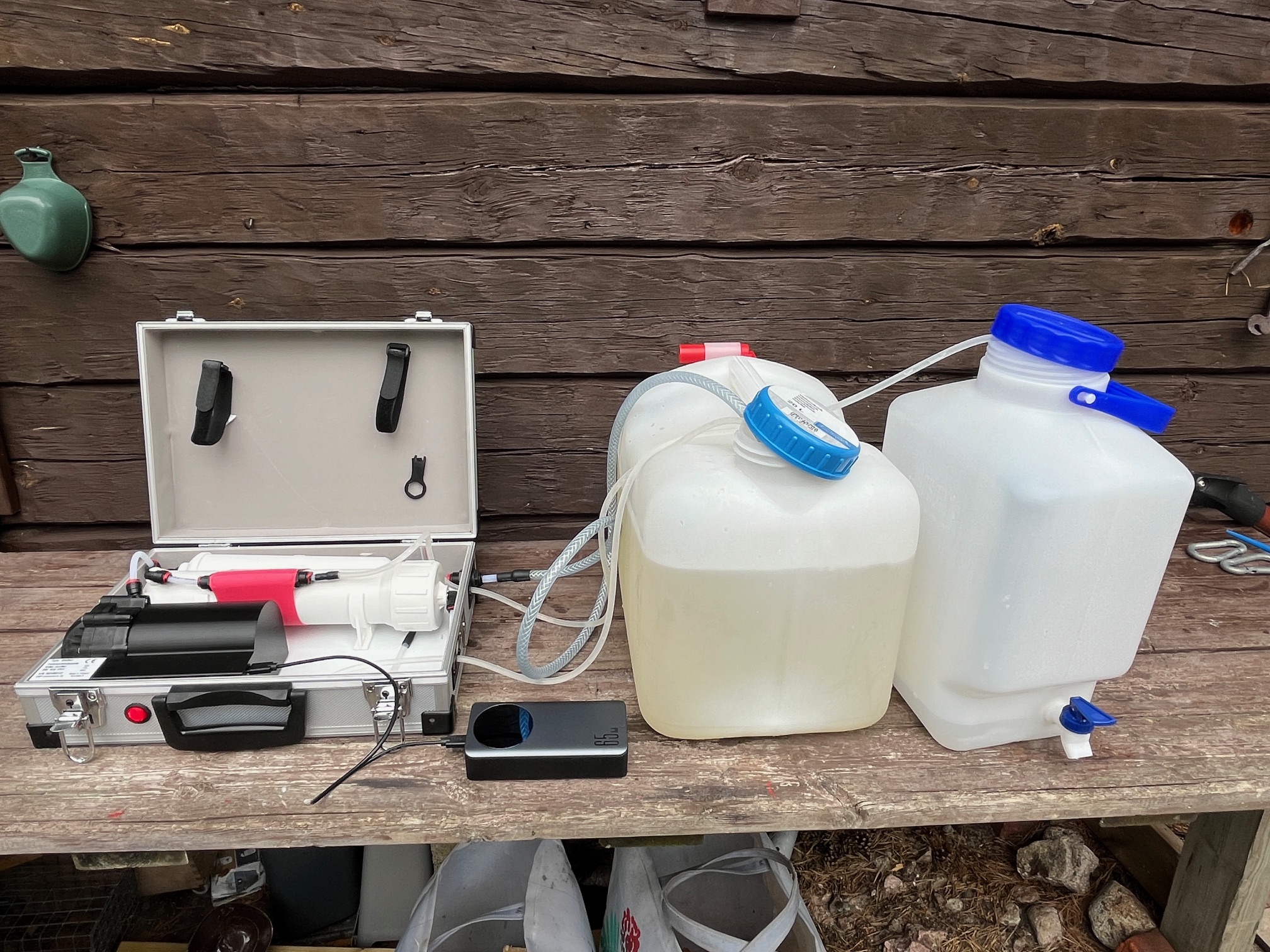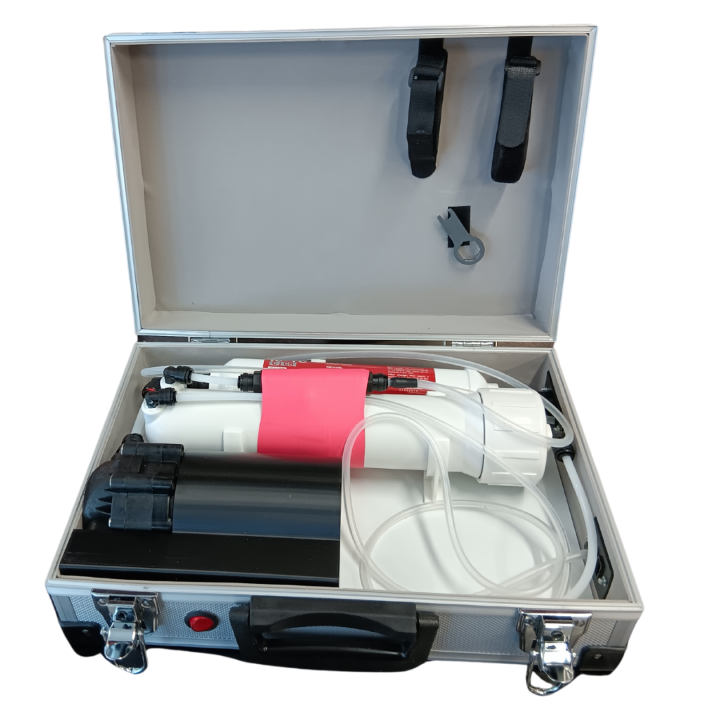 Watteri är en bärbar vattenrenare baserad på omvänd osmos-teknik, som får sin kraft från powerbanks för att ladda mobiltelefoner. Observera att den faktiska strömkällan inte ingår i leveransen av enheten. Du kan köpa den separat från vår webbutik eller annanstans. Kontrollera att din powerbank uppfyller systemets krav. Enheten är självpumpande, så du sätter bara sugslangen i vattnet som ska rengöras, ger ström till enheten från din powerbank och slår på den. Enheten kan också användas med nät- och solenergi genom att använda en snabbladdande USB-C mobiltelefonladdare.